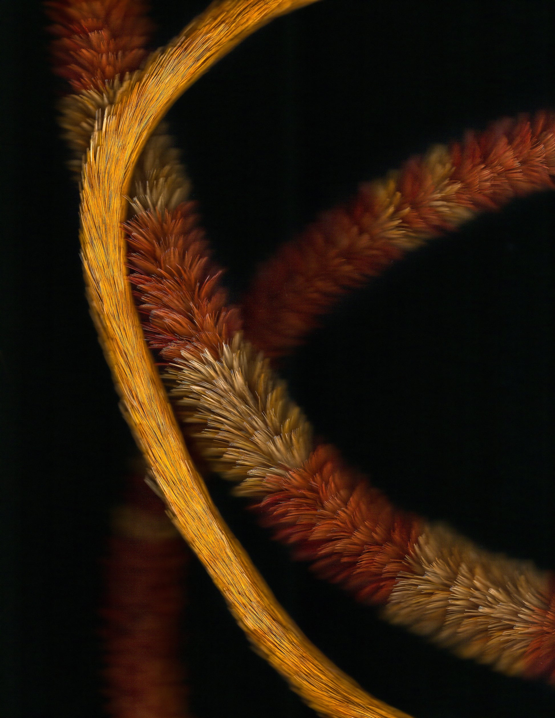 Through the high-resolution scans, the lei hulu becomes both subject and metaphor. Emerging luminous against the black expanse of pō, the feathers suggest a passage from darkness into light. For Phillips, lei hulu embodies resilience and transformation: a practice that illuminates even the deepest of shadows.