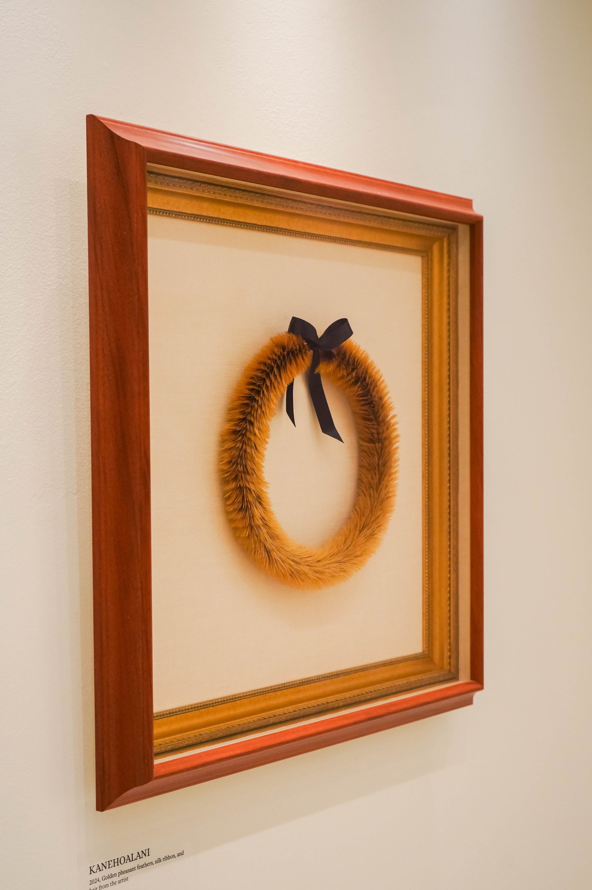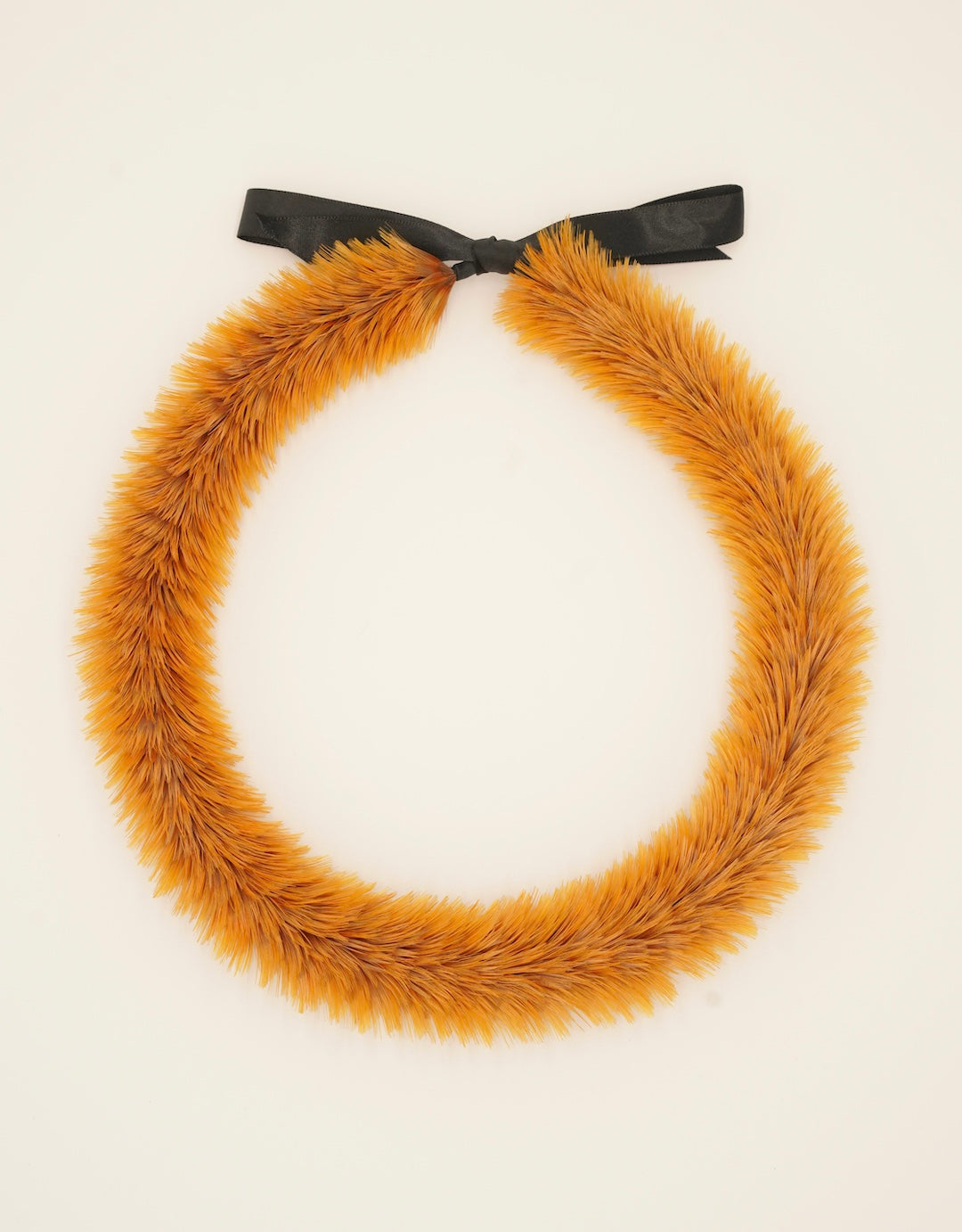 Golden pheasant feathers, peacock feathers, silk ribbon, & hair from the artist